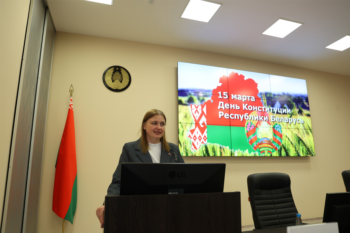 В преддверии Дня Конституции в БелГИСС состоялась встреча коллектива с доцентом кафедры государственно-правовых дисциплин факультета права Академии Министерства внутренних дел Республики Беларусь, кандидатом юридических наук Татьяной Гюрсель.